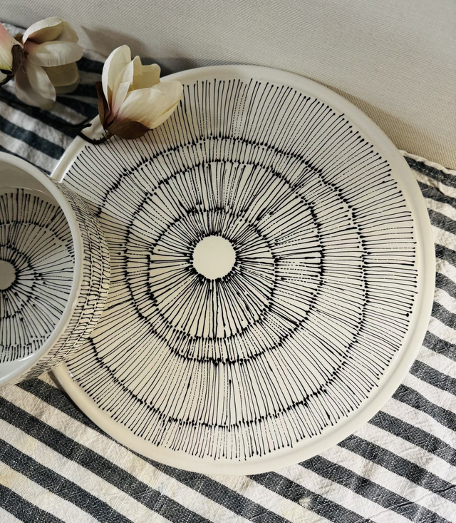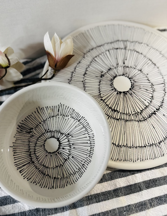 Workshop Highlight in der Tonzeche: Keramikmalen mit der Malflasche! Werde kreativ mit uns und gestalte deine eigene große Schale mithilfe der simplen aber effektvollen Malflaschen-Methode. Dabei werden für einen cleanen Look 1-2 Farben in Malflaschen abgefüllt und damit malst du Striche, Punkte oder andere geometrische Elemente auf deine Keramik. In entspannter Atmosphäre zeigen wie dir Schritt für Schritt, wie du dein Einzelstück bemalst. Wir verwenden hier alle die große "Riso" Schale, die ihr vielleicht schon kennt. Der Workshop ist für Anfänger geeignet! Natürlich gibt es auch bei diesem Spezial-Workshop wieder eine Kleinigkeit zum Essen und Trinken. Bereits erworbene Gutscheine könnt ihr im Warenkorb als Rabattcode anwenden.